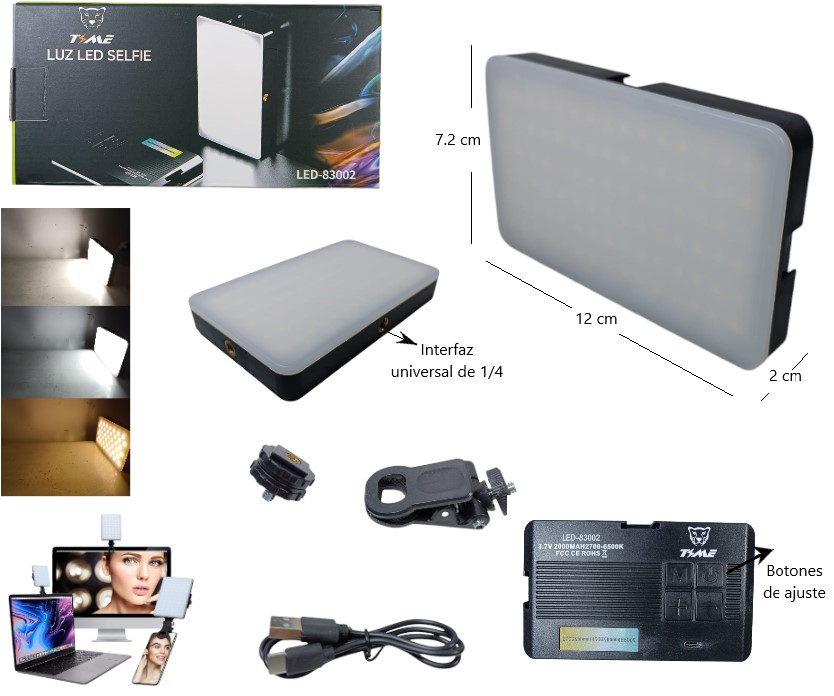 Modelo: LED-83002 Potencia: 6,5 W Alimentación: batería recargable (3,7 V) + carga por USB-C (5 V) Batería: ~ 2000 mAh Temperaturas de color: Blanco frío (~ 6500 K), Cálido, Natural / Neutro (varios tonos) Número de LEDs: ~ 45 unidades Ángulo de iluminación: cerca de 180°; panel rectangular que ofrece dispersión amplia de luz Dimensiones […]